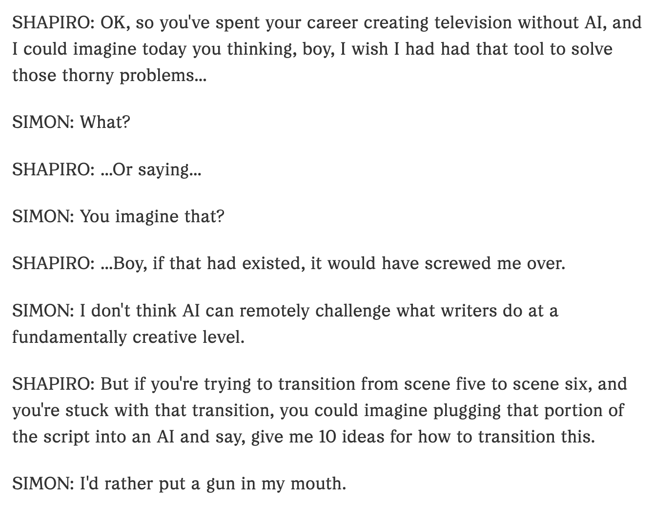 I’m thankful for this quote from David Simon when he was asked about using AI in his work: