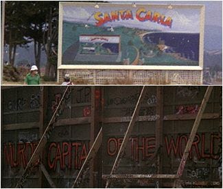 The Lost Boys centers on a family that moved to the fictional town of Santa Carla, California. Lucy, and her two sons Michael and Sam drive into town greeted by a sunny California billboard. Welcome to your new home! BUT the other side of the billboard is covered in graffiti, a warning of MURDER CAPITAL OF THE WORLD. The town is plastered with missing posters posted by grieving family members. Why is this quaint beach town the MURDER CAPITAL OF THE WORLD? Why are so many people missing? Vampires. Vampires are why.
